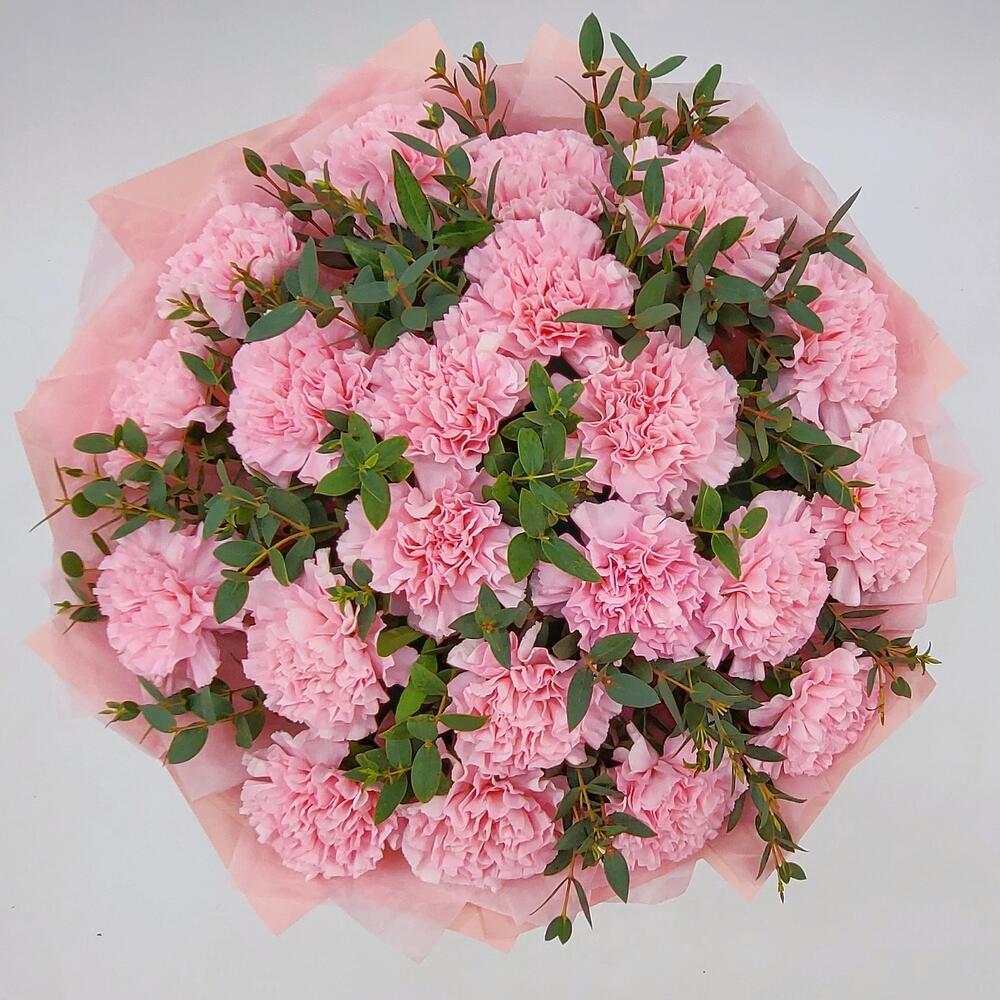 гвоздика сортовая (диантус) – 21 шт.Эвкалипт – 15 шт.Пистация – 10 шт.Упаковка тишью – 8 шт.Упаковка пленка матовая – 7 шт.Лента атласная – 1 шт.