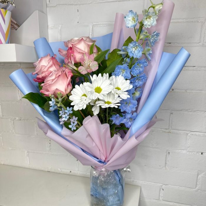 Роза Эквадор – 3 шт.Дельфиниум – 1 шт.Хризантема кустовая – 1 шт.Фисташка – 3 шт.Корейская упаковка – 3 шт.