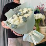 Букет белых пионовидных роз с эвкалиптом – «15 почему я тебя люблю»