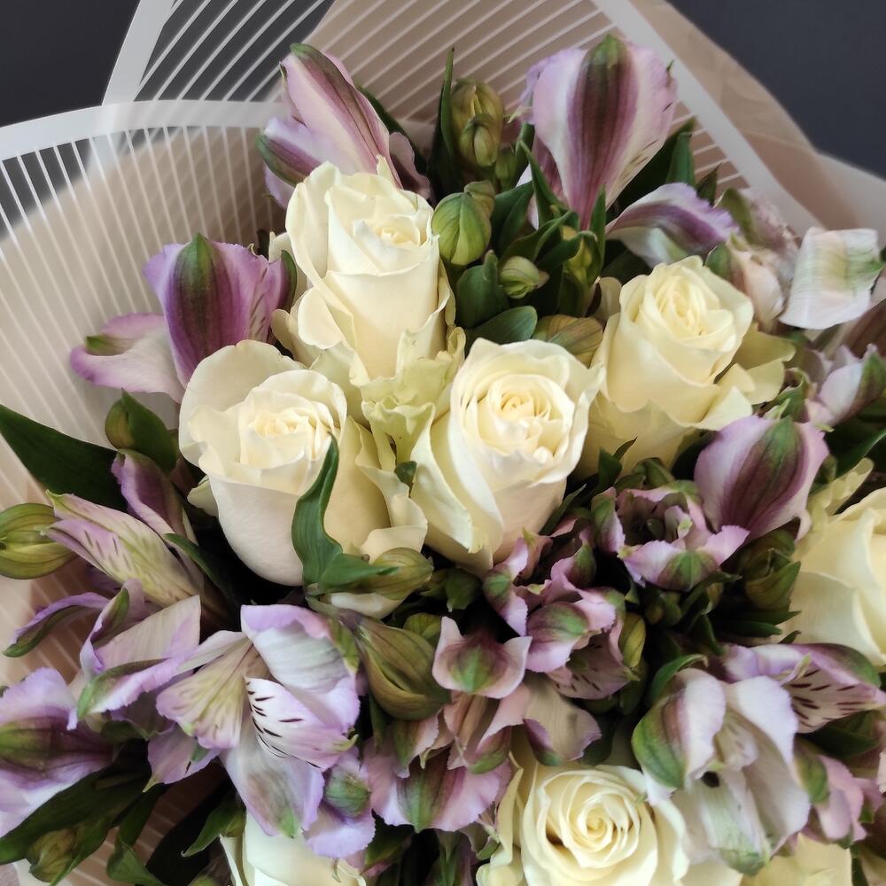 Букет из белых роз и фиолетовых альстромерий М