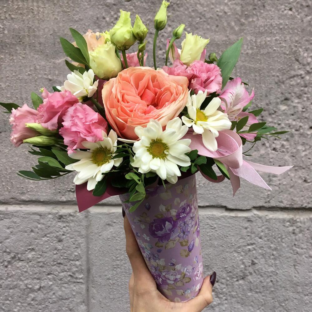 Роза кахала пионовидная – 1 шт.Альстромерия – 1 шт.Хризантема кустовая – 2 шт.Лизиантус розовый – 2 шт.Коробка конус – 1 шт.Оазис флористический – 1 шт.Лента атласная – 1 шт.