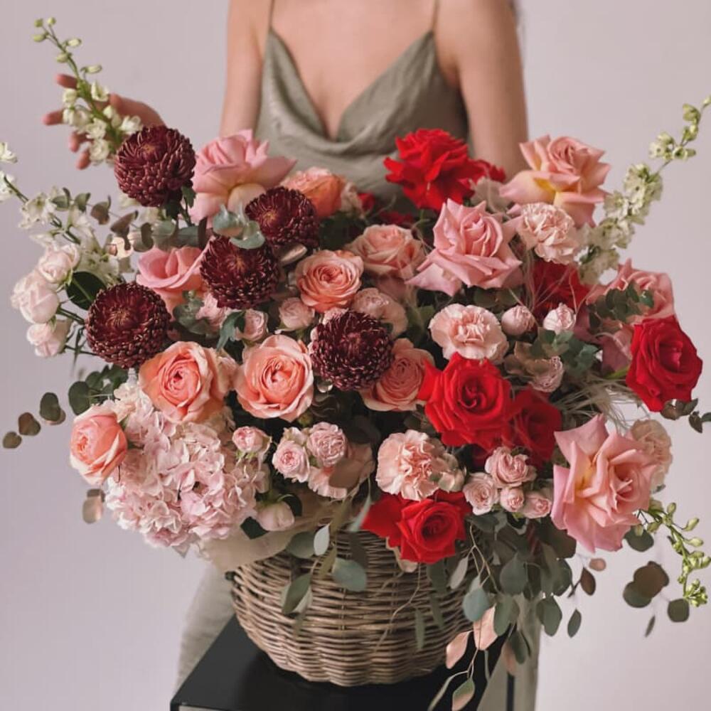 Роза пионовидная – 15 шт.Хризантема – 7 шт.Роза кустовая – 7 шт.Дельфиниум – 4 шт.Роза – 10 шт.Эвкалипт – 10 шт.Гортензия – 1 шт.Гвоздика – 11 шт.