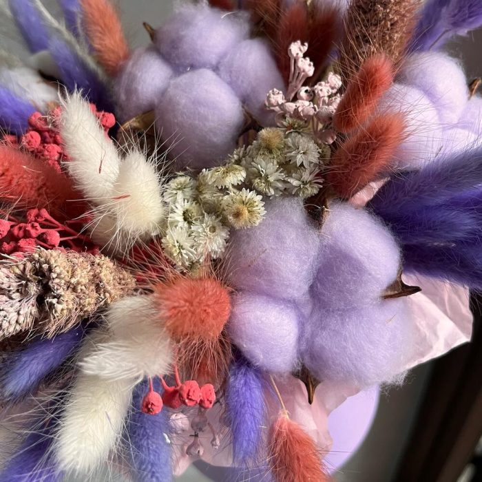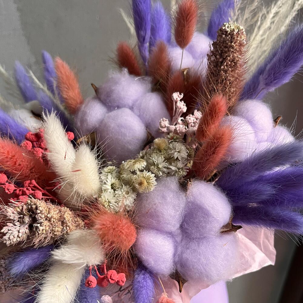 Коробка шляпная – 1 шт.Оазис флористический – 1 шт.Хлопок натуральный – 2 шт.хлопок цветной – 3 шт.лагурус белый пучок – 1 шт.лагурус сиреневый пучок – 1 шт.лагурус розовый пучок – 1 шт.ситария сухоцвет – 3 шт.сухоцвет стифа – 3 шт.Тишью розовая – 1 шт.